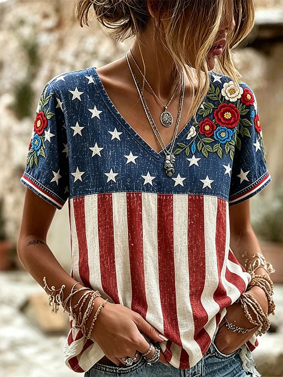 Women's American Flag Floral Print Casual T-shirt
