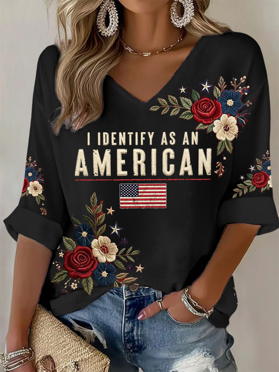 Women's I Identify As An American Floral USA Flag Print Casual Patriot Waffle Top